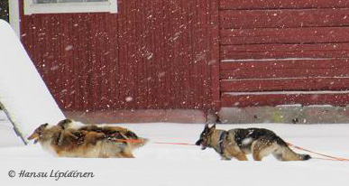 Saksanpaimenkoira Huku valjakossa, minivaljakon johdossa Nox &